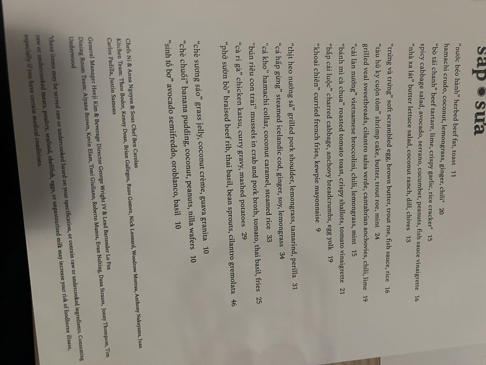 Highlights of the menu include the refreshing Crudo with coconut milk and ginger, the soft scrambled eggs with savory flavors, and the well-cooked Colorado trout reminiscent of traditional Vietnamese flavors. The pork shoulder is highlighted for its flavorful and tender meat, while the Khaoi chien (Curry French fries) stand out for their crispy texture and spicy curry flavor.